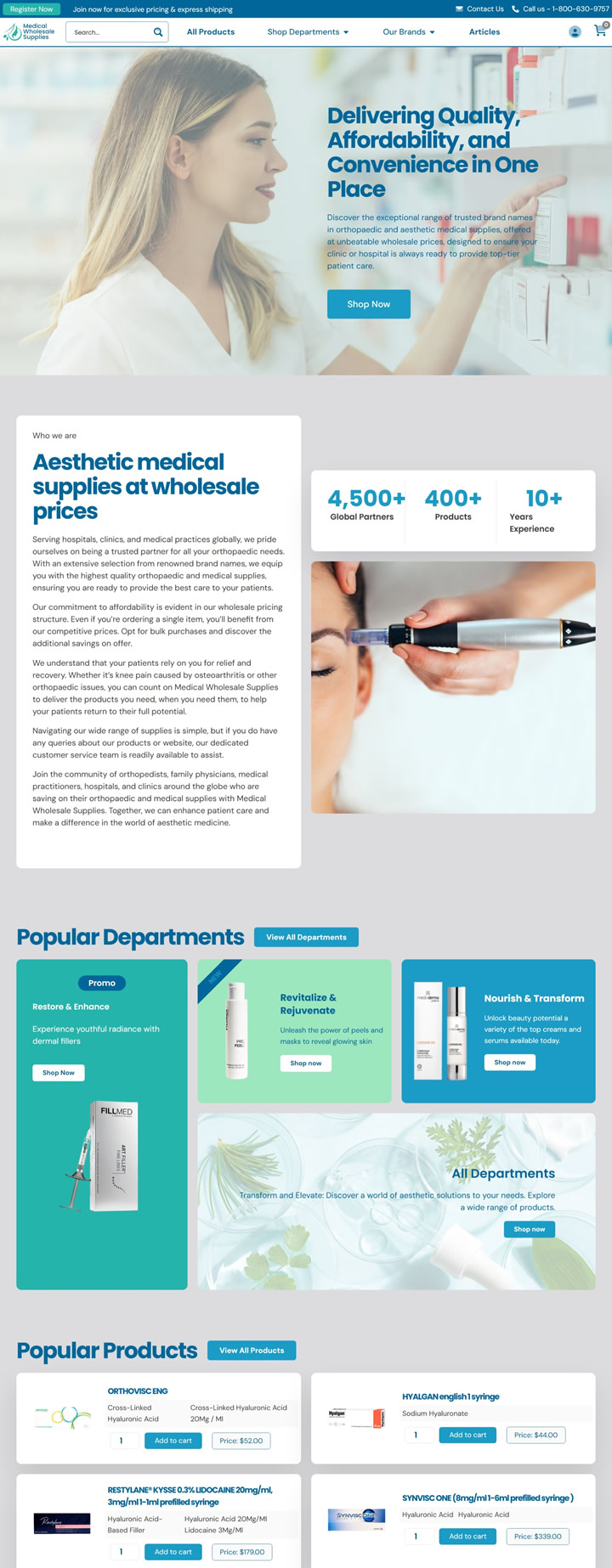 The global aesthetic medicine market, is a thriving industry valued $127.11 billion in 2023. This market will maintain a robust growth rate, with a 14.9% compound annual growth rate from 2024 to 2030. These figures highlight the potential for businesses operating in this specific segment. Within this context, Medicalwholesalesupplies.com emerges as a dynamic platform catering to the growing demand for affordable aesthetic medications and supplies. Our extensive network of 10,000+ clients, including clinics, aesthetic experts, and orthopedic surgeons rely on us for cost-effective solutions that allow them to optimize their expenses without compromising on quality. Our platform boasts of a diverse range of products, such as dermal fillers, botulinum toxins, mesotherapy supplies, peels, masks, creams, threads, and orthopedic supplies. This selection ensures that our customers have access to a wide variety of high-quality options to meet their specific needs.